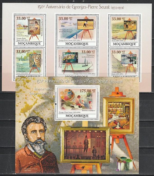 Художник Сёра, Живопись, Мозамбик 2009 год, малый лист + блок