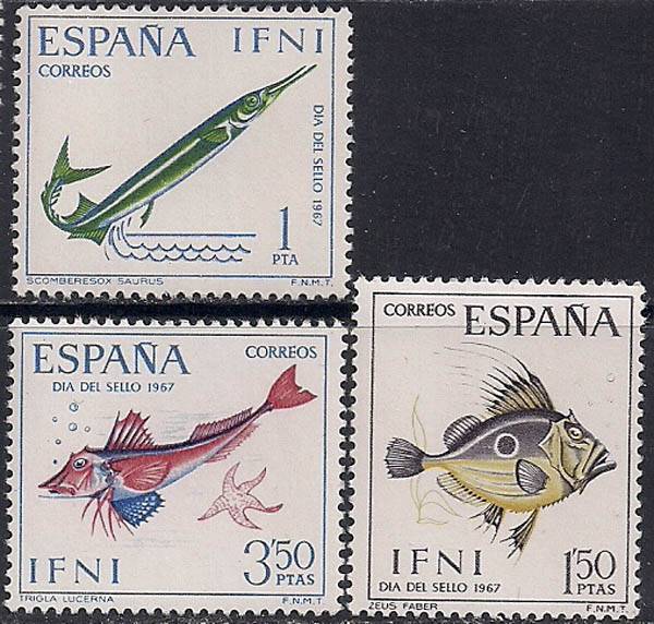 Ифни (Марокко) 1967 год. Рыбы. 3 марки с наклейкой