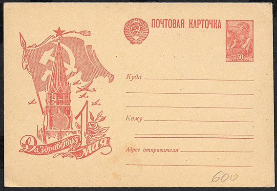 Иллюстрированная односторонняя почтовая карточка 7-26, 1945 год. 1 мая