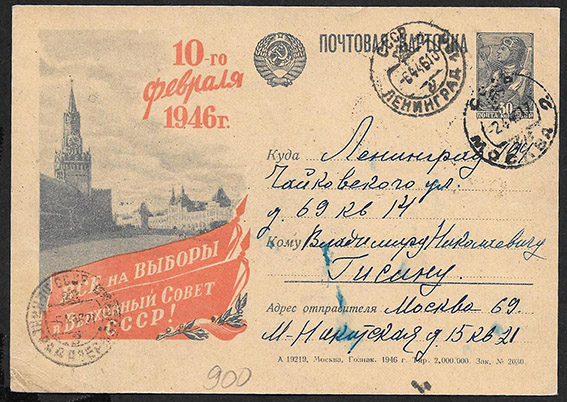 Иллюстрированная односторонняя почтовая карточка № 7-29, 1946 год. Все на выборы в ВС, прошла почту