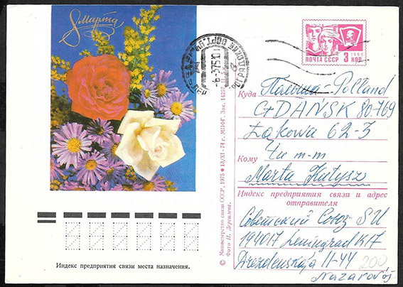 Иллюстрированная односторонняя почтовая карточка, 1975 год. 8 марта, прошла почту