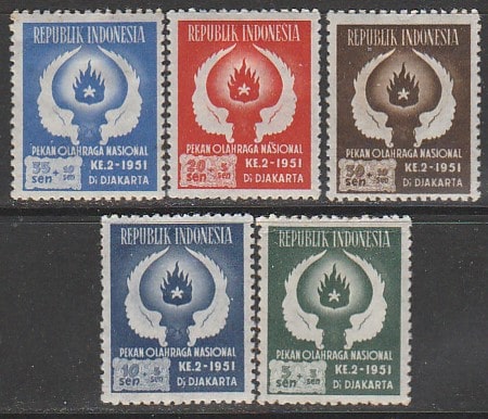 Индонезия 1951 год. Национальный спортивный фестиваль в Джакарте, 5 марок (наклейка)