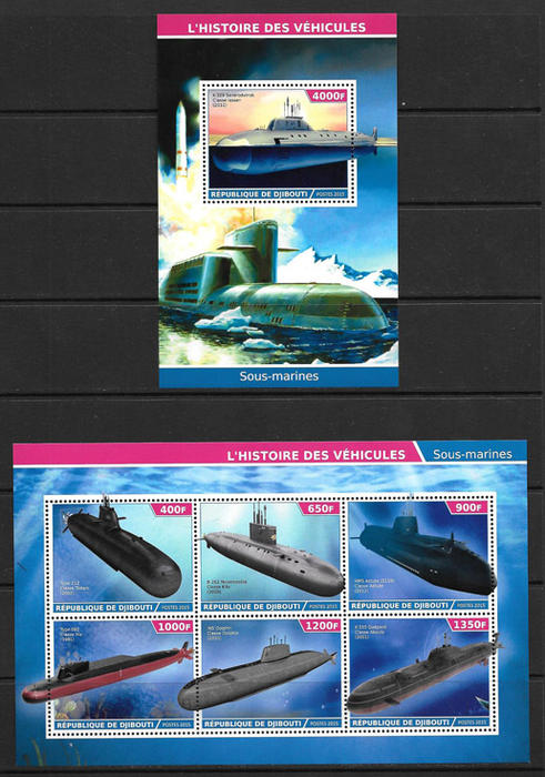 История транспортных средств. Субмарины. Джибути 2015 год. Блок и малый лист