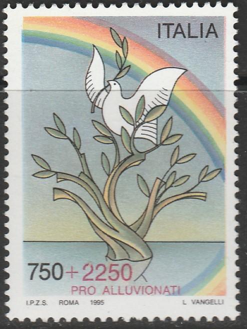 Италия 1995 год. Белый голубь с веткой оливы на дереве в воде. Радуга. 1 марка