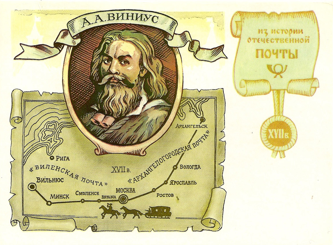 Андрей Андреевич Виниус (1641-1717) русский государственный деятель эпохи Петра I, первый русский почтмейстер. А.А. Виниус ввел для почтарей новую форму, учредил почтовые ящики из белой жести для отправки писем за границу, заключил новый почтовый договор с Ригой, а 10 декабря 1685 г. подписал соглашение об обмене почтой между Москвой и Вильно (Вильнюс). Является и организатором почты к берегам Белого моря - архангелогородской почты. Портрет А.А. Виниуса, приведенный на открытке, нарисован художником Л. Гусиковым в 1874 г.
