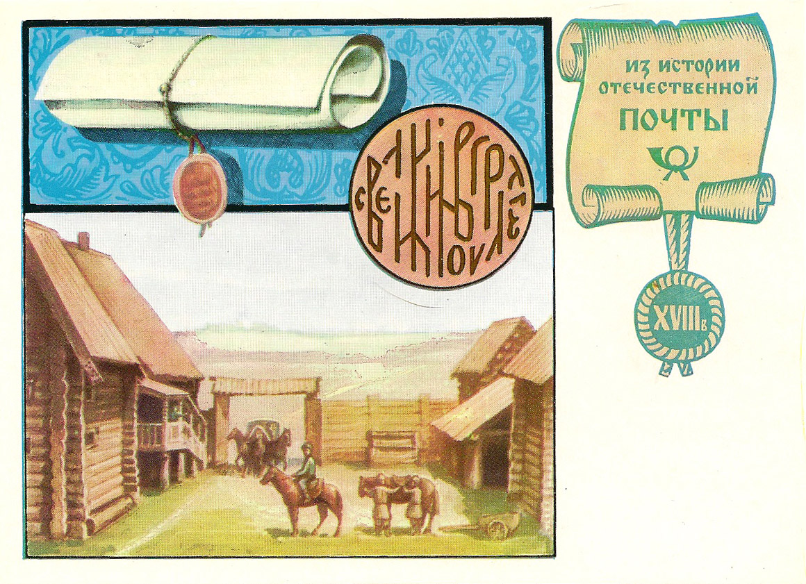 Правила оформления отправлений в старину отличались от современных. На письмах от руки делались отметки о времени приема. Затем корреспонденция заворачивалась в плотную бумагу и перевязывалась веревкой. Получался, как тогда говорили, "связок". Пачки писем и почтовые сумки опечатывались сургучными печатями. Русские почтовые печати появились на рубеже XVII-XVIII вв. Сначала они применялись в Москве, Пскове и Новгороде. Последняя воспроизведена на открытке.
