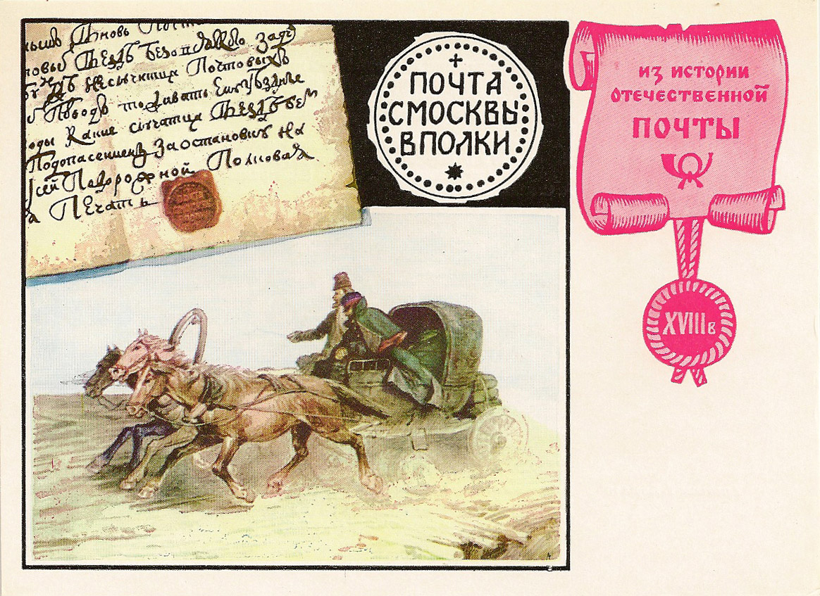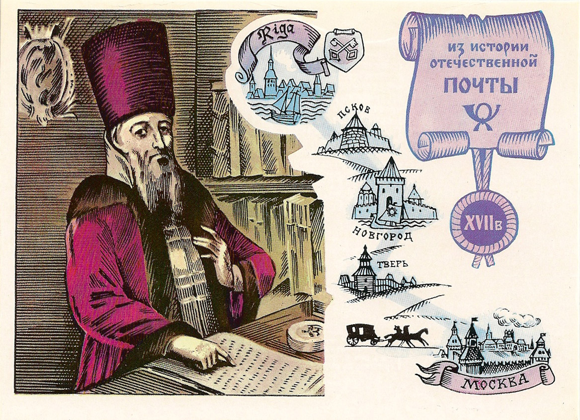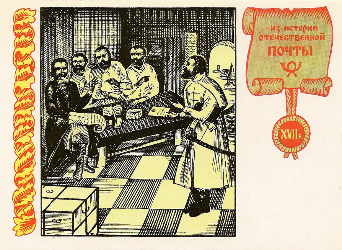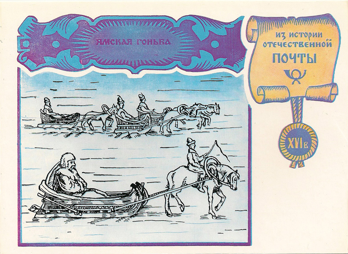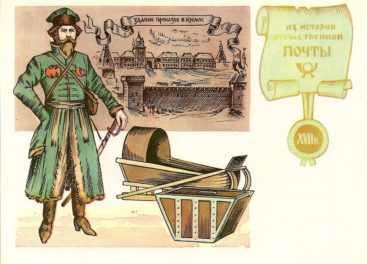 На старинной гравюре, хранящейся в Государственном Историческом музее, изображено здание приказов в Московском Кремле. Здесь помещался и Ямской приказ. Среди прочих дел он обеспечивал ямщиков форменной одеждой. Одна из форм (по указу 1669 г.) представлена на рисунке открытки. Здесь же можно увидеть сани и ящик для перевозки зарубежной корреспонденции (по макетам Центрального музея связи им. А.С. Попова).