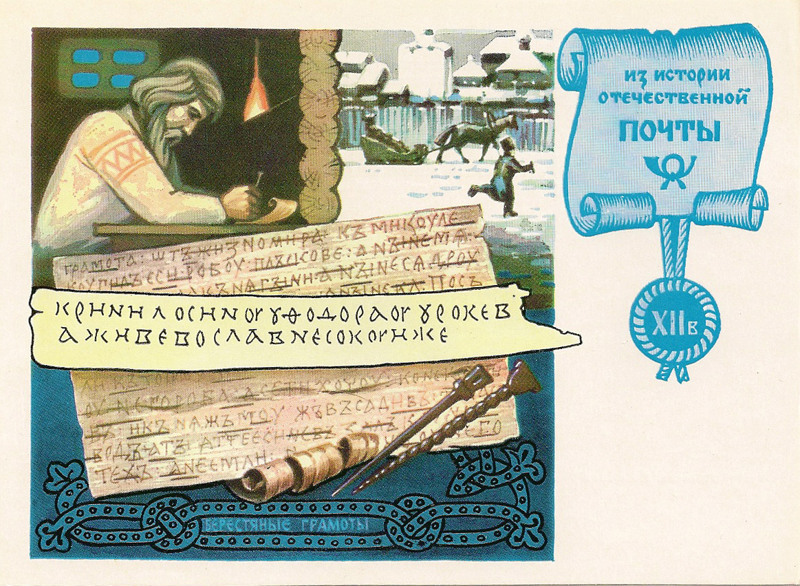 Свыше 500 берестяных грамот и множество "писал", инструментов для выдавливания букв на бересте, извлекли советские археологи из раскопок в Новгороде. Эти находки подтверждают не только высокую грамотность новгородцев, но и существование хорошо организованной почтовой связи. Грамоту второй половины XII в., текст которой воспроизведен на рисунке открытки, можно перевести так: "Сыну Кринилы. У Федора Урокеева.. А живет во Славне.. "Этот почтовый адрес к частному письму - древнейший в мире.
