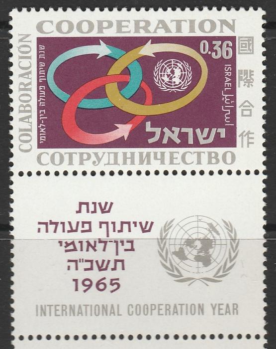 Израиль 1965 год. Год Международного сотрудничества. Эмблема ООН. 1 марка с купоном