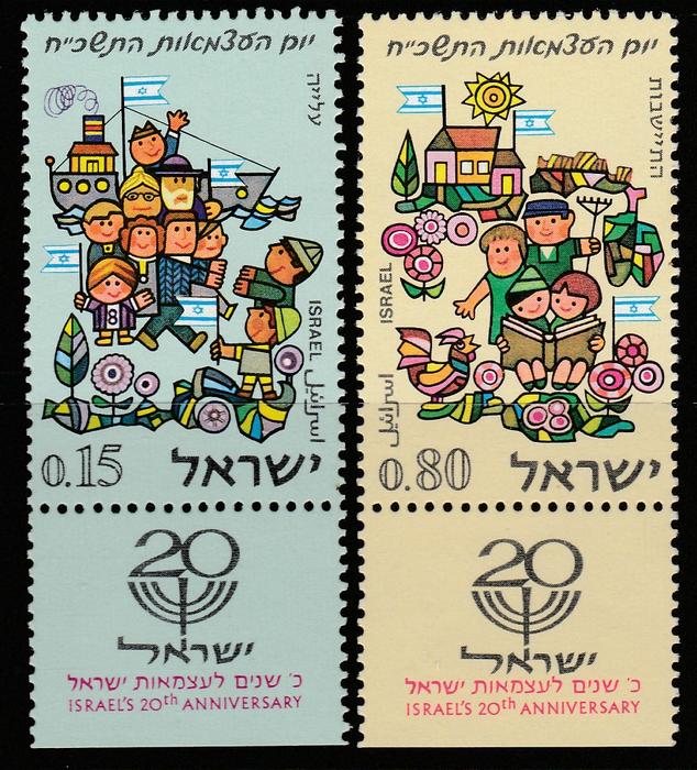 Израиль 1968 год. 20 лет Независимости. Ассимиляция переселенцев. 2 марки с купонами