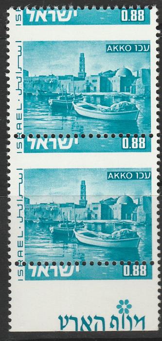 Израиль 1971 год. Акра, город в Западной Галилее. 2 марки с купоном. брак печати, сдиг перфорации