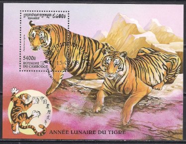 Камбоджа 1998 год. Тигры. Блок (гашеный)