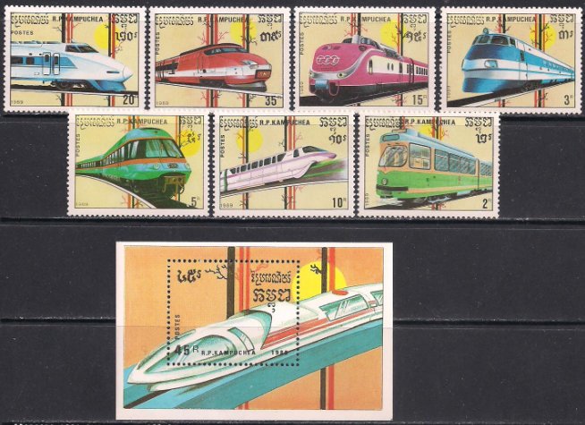 Камбоджи 1989 год. Локомотивы. 7 марок + блок