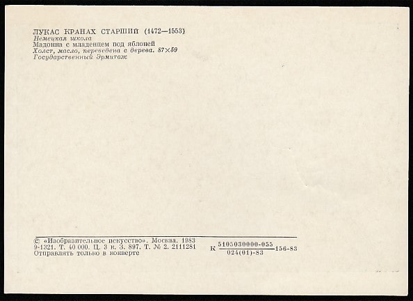 Картмаксимум. 225 лет Государственному Эрмитажу. Картина Лукаса Кранаха "Мадонна с младенцем", 17.10.1989 год, Ленинград, почтамт