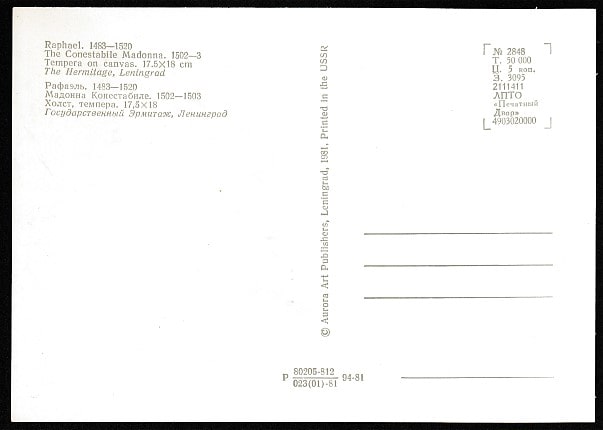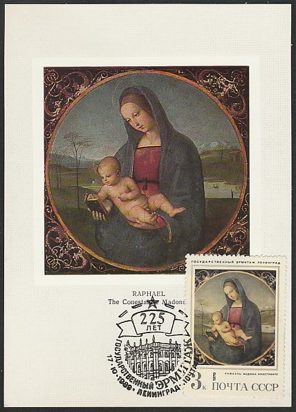 Картмаксимум. 225 лет Государственному Эрмитажу. Картина Рафаэля "Мадонна Конестабиле", 17.10.1989 год, Ленинград, почтамт