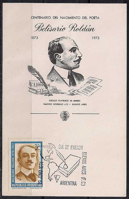 Картмаксимум Аргентина. 100 лет со дня рождения писателя Белизарио Ролдена, 29.06.1974 год, Буэнос-Айрес