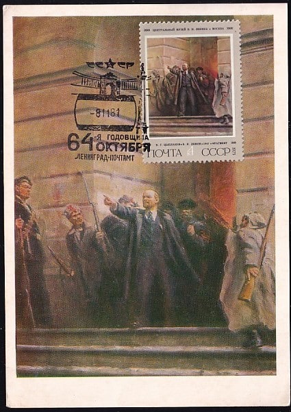 Картмаксимум со СГ "64-я годовщина Октября", 8.11.1981 год, Ленинград (пятно на обороте)