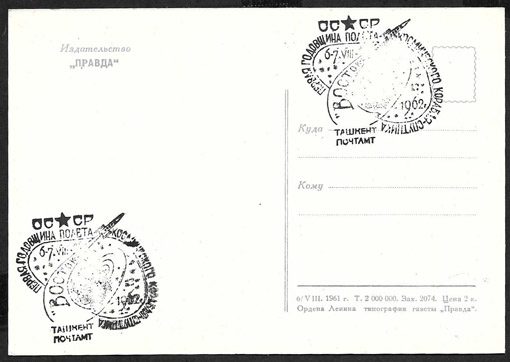 Картмаксимум со спецгашением Восток-2, Ташкент, 1962 г.
