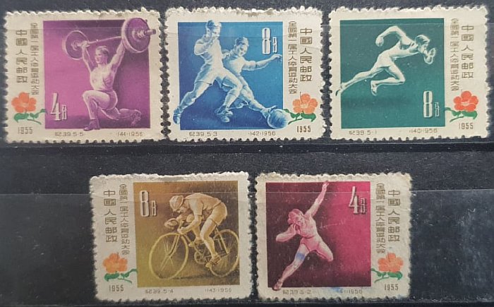 Китай 1957 год. 1-я спартакиада. Серия 5 марок (гашеные и с наклейкой)