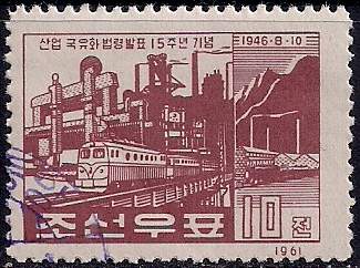 КНДР 1961 год.15 лет принятию закона о национализации промышленности.1 гашёная марка
