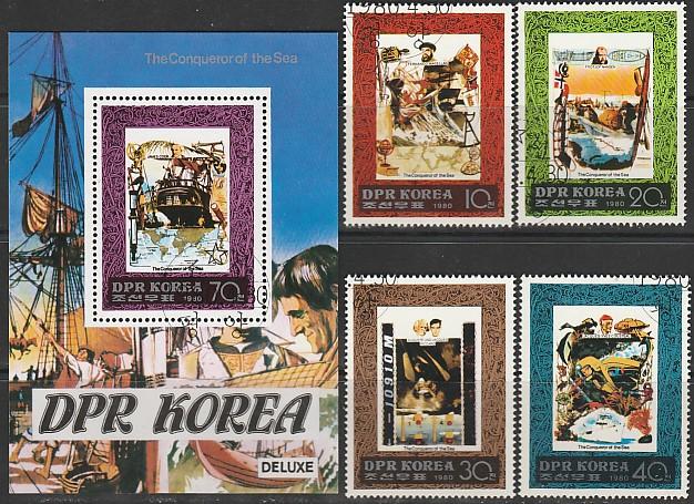 КНДР 1980 год. Морские исследования. Мореплаватели, 4 марки + блок (гашёные)