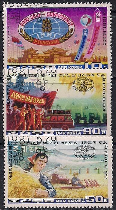 КНДР 1981 год. Симпозиум развивающихся стран. Колосья, знамена. 3 гашеные марки
