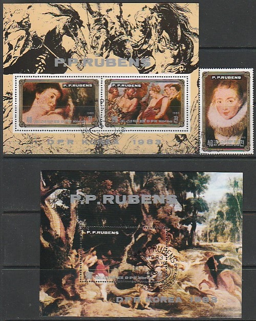 КНДР 1983 год. Картины фламандского художника Питера Пауля Рубенса, 1 марка + 2 блока (гашёные)