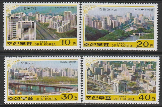 КНДР 1993 год. Архитектура Пхеньяна, 4 марки из пяти.
