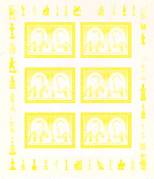 КНДР 2001 год. Чемпионы мира по шахматам 20-го века. А. Алехин и М. Эйве. Малый лист. Разновидность - проба цвета (желтый)