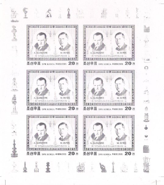 КНДР 2001 год. Чемпионы мира по шахматам 20-го века. А. Алехин и М. Эйве. Малый лист. Разновидность - проба цвета (белый)