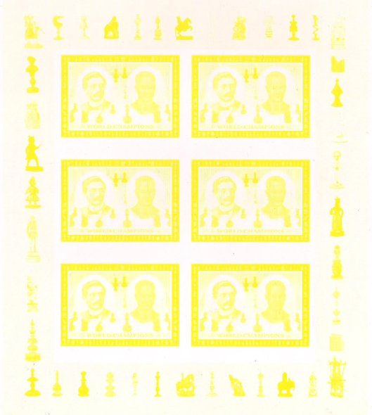 КНДР 2001 год. Чемпионы мира по шахматам 20-го века. Э. Ласкер и Х. Капабланка. Малый лист. Разновидность - проба цвета (желтый)