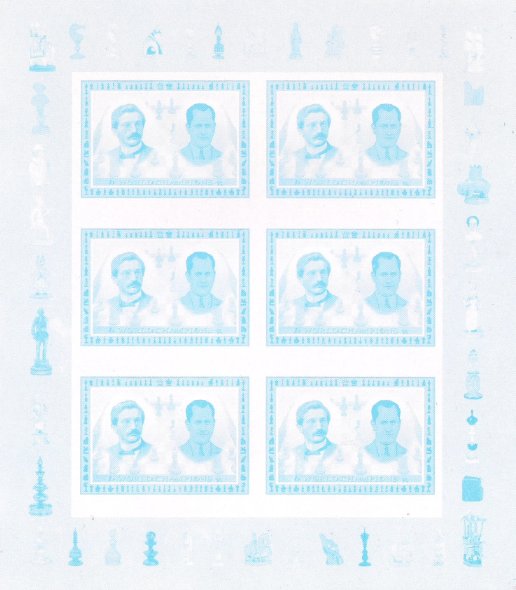 КНДР 2001 год. Чемпионы мира по шахматам 20-го века. Э. Ласкер и Х. Капабланка. Малый лист. Разновидность - проба цвета (синий)