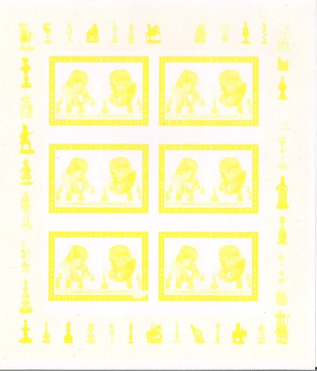 КНДР 2001 год. Чемпионы мира по шахматам 20-го века. А. Карпов и Г. Каспаров. Малый лист. Разновидность - проба цвета (желтый)