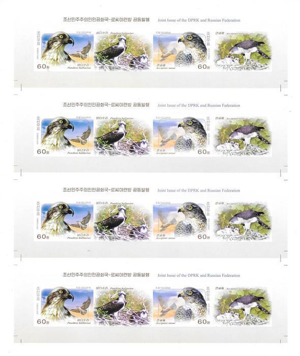 КНДР 2014 год. Совместный выпуск Корея - Россия, хищные птицы, 2 полосных листа.с зубцами и беззубцов.