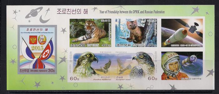 КНДР 2015 год. Годовщина дружбы Северной Кореи и России. 1 малый лист без зубцов КОСМОС