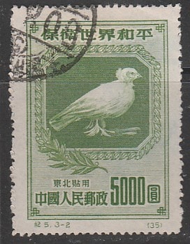 КНР (Северо-Восточный Китай) 1950 год. Голубь. Пропаганда мира во всём мире, ном. 5000 $, 1 марка из серии (гашёная)