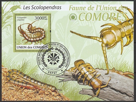 Коморы 2009 год. Многоножки. Сколопендры, блок (гашёный)