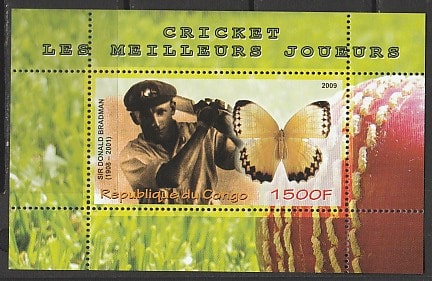 Конго 2009 год. Австралийский игрок в крикет Дональд Брэдмен. Бабочка, блок