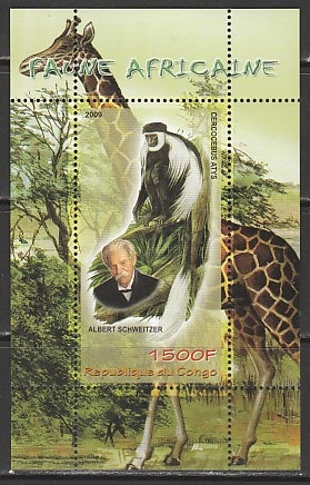 Конго 2009 год. Нобелевский лауреат Альберт Швейцер. Африканская фауна, блок Сувенирный выпуск.