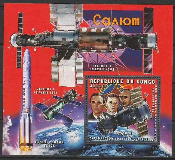 Конго 2011 год. "Союз-11". Космонавты: Г. Добровольский, В. Волков и В. Пацаев, блок.