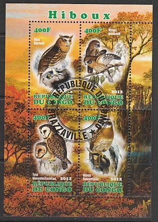 Конго 2012 год. Совы, малый лист (гашёный) Сувенирный выпуск.