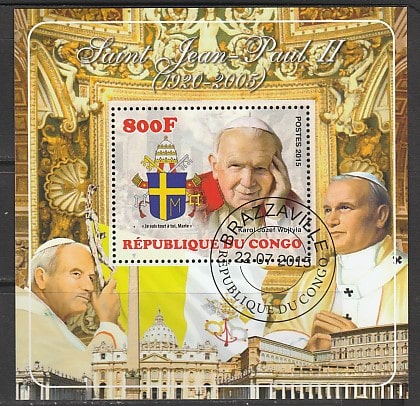 Конго 2015 год. Папа Римский Иоанн Павел II и герб Ватикана, гашёный блок Сувенирный выпуск.
