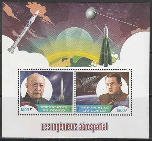 Конго 2016 год. Аэрокосмические инженеры: Цянь Сюэсэнь и Сергей Королёв, малый лист. Сувенирный выпуск.