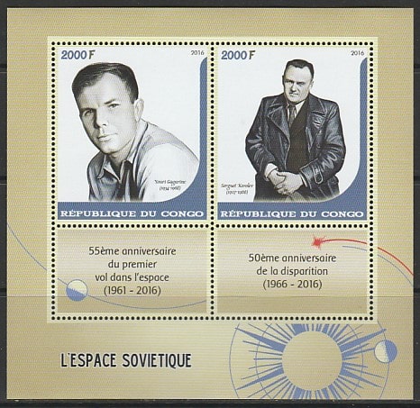 Конго 2016 год. Конструктор С.П. Королёв и космонавт Ю.А. Гагарин, малый лист.