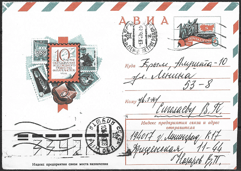 Конверт 10 летие образования Всесоюзного общества филателистов-1. 23.02.1976 год. Прошёл почту