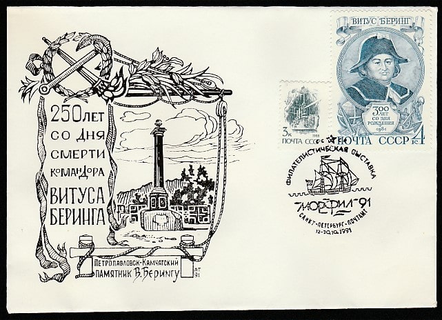Конверт. 250 лет со дня смерти В.И. Беринга. Памятник в Петропавловске-Камчатском, 1991 год, спецгашение. МГП "Филателия". Тир. 1000 экз.