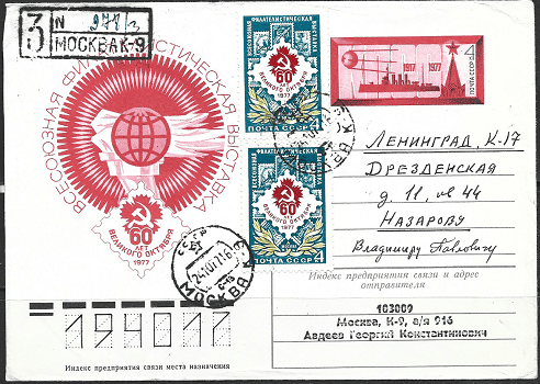 Конверт 60 лет Великого Октября. Всесоюзная филателистическая выставка. 16.09.1977 год. Прошёл почту.