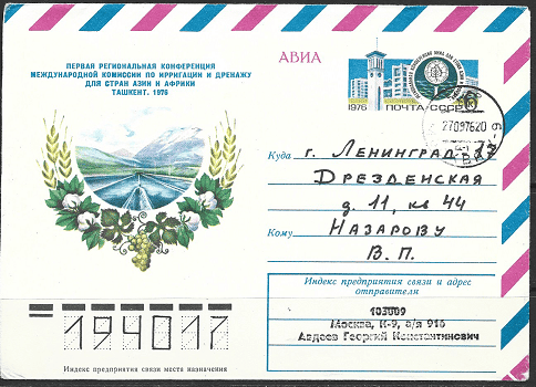 Конверт Авиа. Первая региональная конференция международной комиссии по ирригации и дренажу для стран Азии и Африки. Ташкент. 18.08.1976 год Прошёл почту.