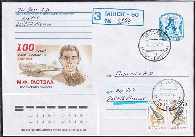 Конверт Беларуси. Н. Ф. Гастелло, 2007 год, прошел почту