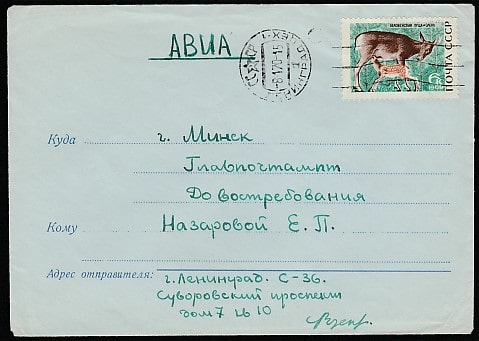 Конверт. Беловежская пуща. Олень, 1969 год, прошёл почту